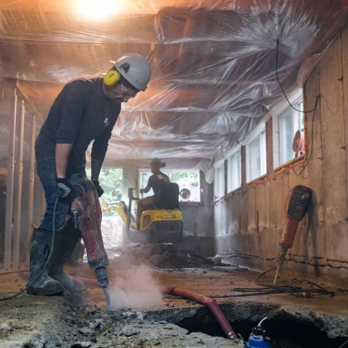Équipe et équipement complets, incluant excavation, imperméabilisation et fondations.